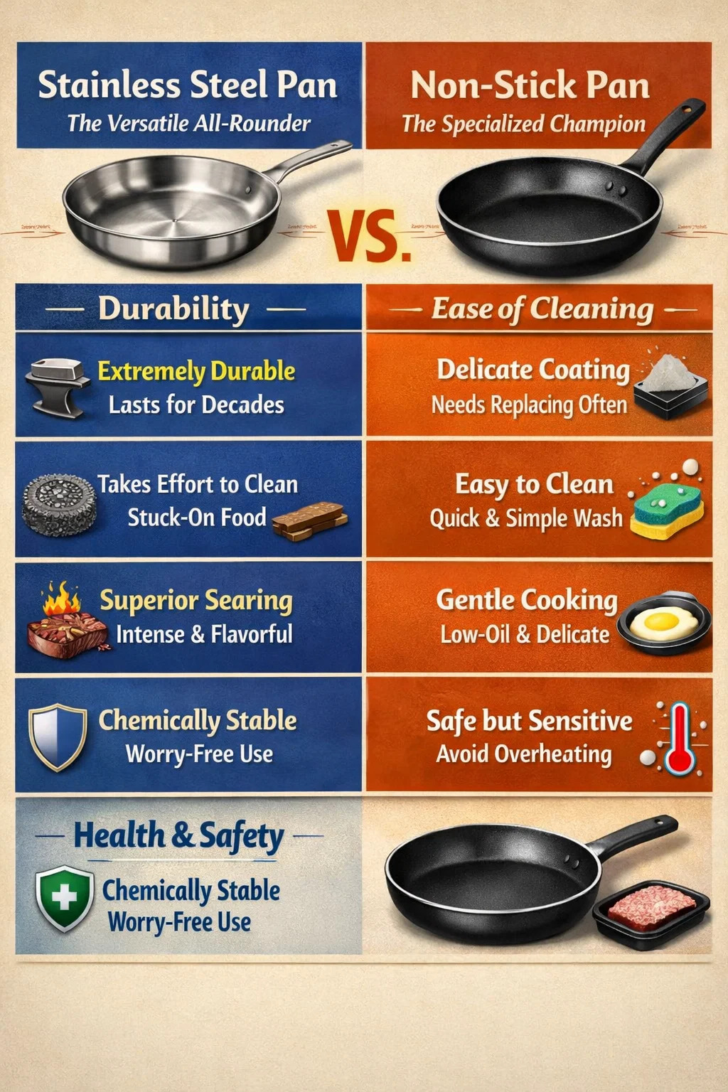 Panner i rustfritt stål: Materialet er veldig stabilt og vil ikke reagere kjemisk med mat. Selv når du tilbereder sure matvarer som tomatsaus, er det absolutt ingen grunn til bekymring. Ikke-klebende panner: Moderne non-stick kokekar fra anerkjente merker er veldig trygt for daglig bruk. Men hvis du er psykologisk bekymret for at belegget skal av eller produsere lukt når det overopphetes, kan rustfritt stål gi deg mer trygghet.